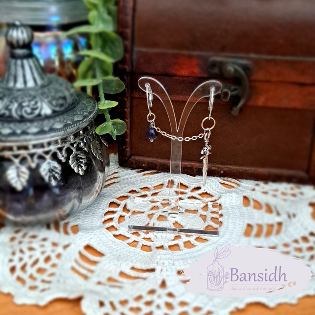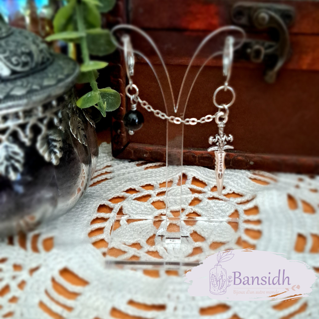 Les anneaux d'oreilles et la chaine , la dague sont en alliage et la perle en véritable pierre : améthyste, grenat ou tourmaline noire.