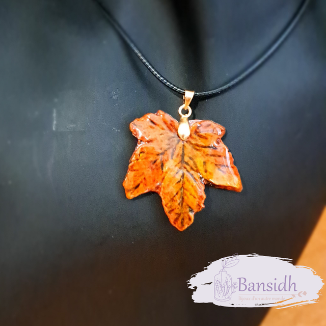 Collier cordon ciré et feuille d'automne faite main en pâte autodurcissante.