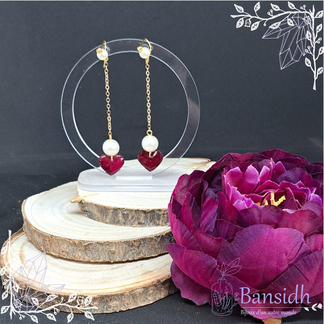 J'utilise des véritables pétales de fleurs, que je fais sécher, puis que je recouvre de résine, ce qui les conserve et les rend plus résistant