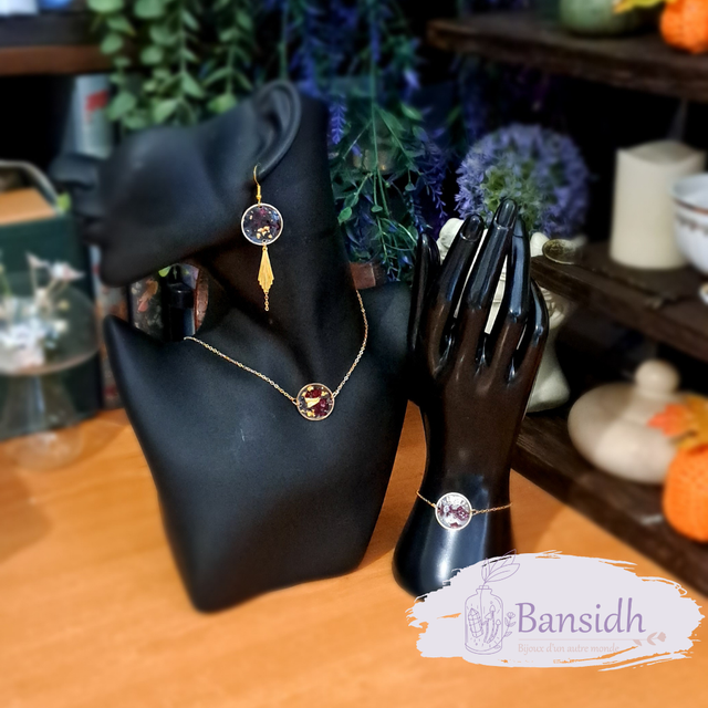 La parure est composée des boucles d'oreilles, du collier ainsi que du bracelet assortie.