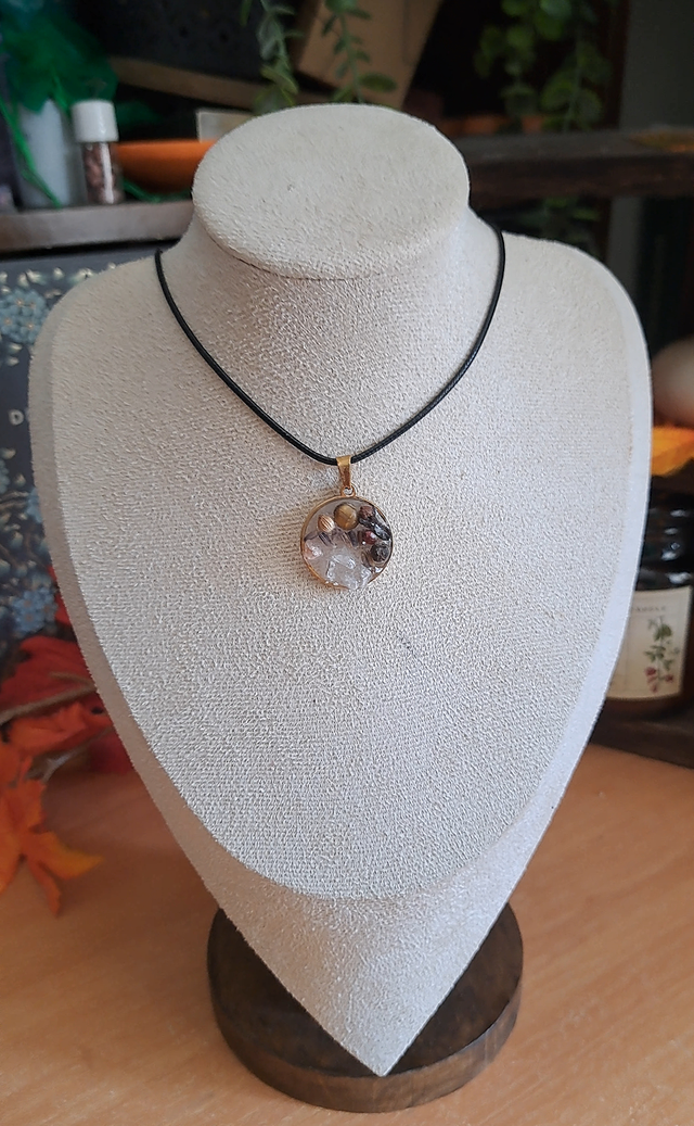 Composée de différents éléments connus pour leurs vertus de protection : cristaux de sel, grains de poivre, fleurs de lavande, clou de girofle, et pierre œil de tigre, cette amulette enchantée, infusée de leur bienfaits vous apportera protection au quotidien.